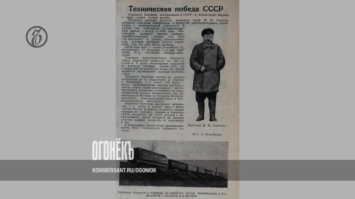 95 лет назад «Огонек» писал об испытании первого в мире тепловоза, изобретенного советским инженером Яковом Гаккелем. Журнал приводил технические характеристики нового вида транспорта и сравнивал его с паровозом: «В кузове тепловоза находится 10-цилиндровый дизель — мотор в 1000 лош. сил, который вращает динамо-машины, вырабатывающие электр. ток. Этот ток поступает в десять электромоторов, которые вращают колеса тепловоза, так же как вагон трамвая. (…) Главным преимуществом тепловоза перед паровозом является то, что он почти в 4 раза экономичнее по расходу топлива. Кроме того, он совершенно не расходует воды, что также является чрезвычайно важным достоинством».
