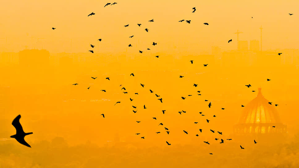 Птицы на рассвете на фоне павильона «Космос» на ВДНХ