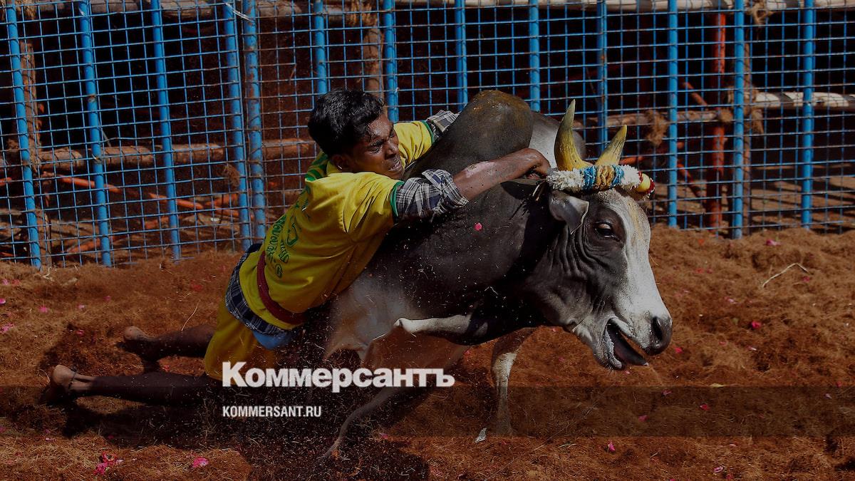 Мадурай, Индия. Местный житель пытается укротить быка во время индуистского праздника урожая