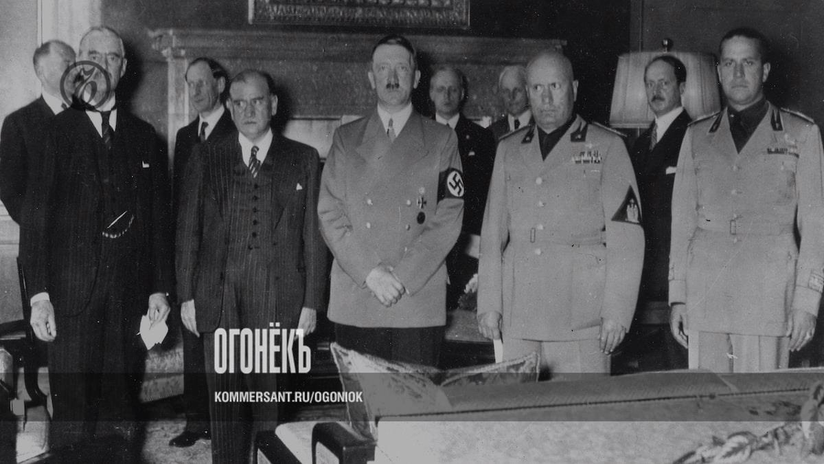 «Спусковым крючком» стал «мюнхенский сговор» в сентябре 1938 года, который развязал руки Берлину и открыл череду территориальных захватов. Его ключевые участники (слева направо): Невилл Чемберлен (Великобритания), Эдуард Даладье (Франция), Адольф Гитлер, Бенито Муссолини (Италия)
