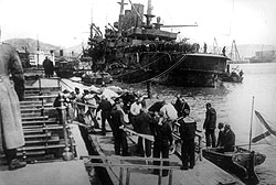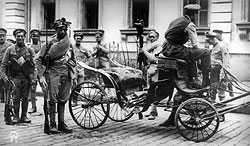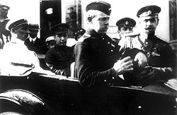 | Александр Колчак и Александр Керенский (на заднем сиденье автомобиля) в Севастополе вместе пытались сохранить боеспособность Черноморского флота |