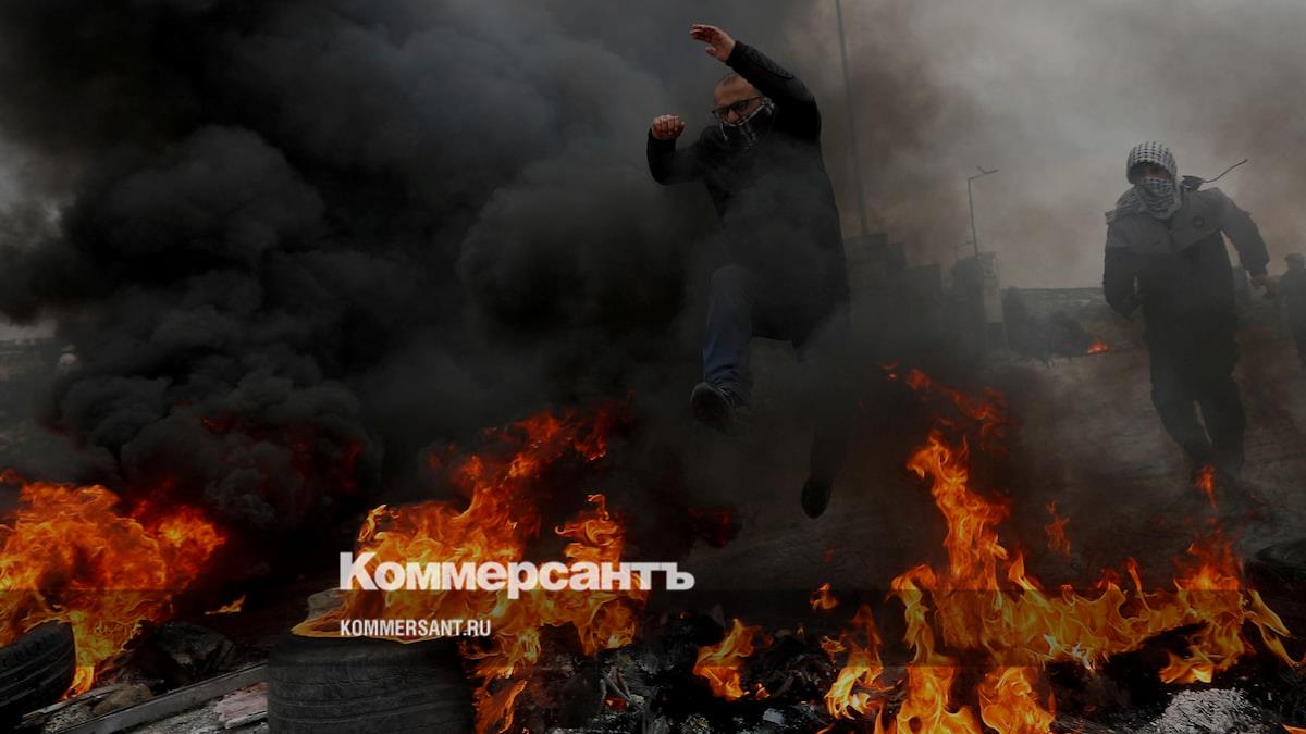 Бейт-Эль, Западный берег реки Иордан. Палестинец перепрыгивает через горящие шины во время акции протеста