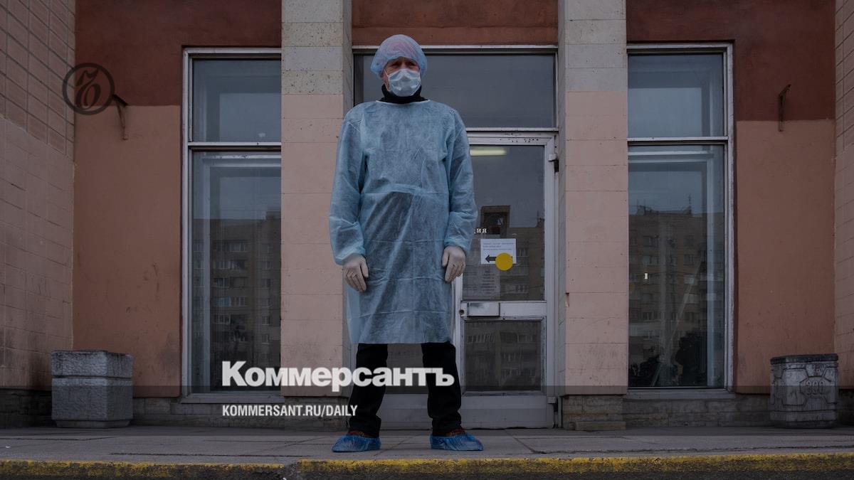 Мужчина в защитной спецодежде на крыльце здания учебно-клинического комплекса №2, находившегося на карантине в рамках мер нераспространения коронавируса 2019-NCOV