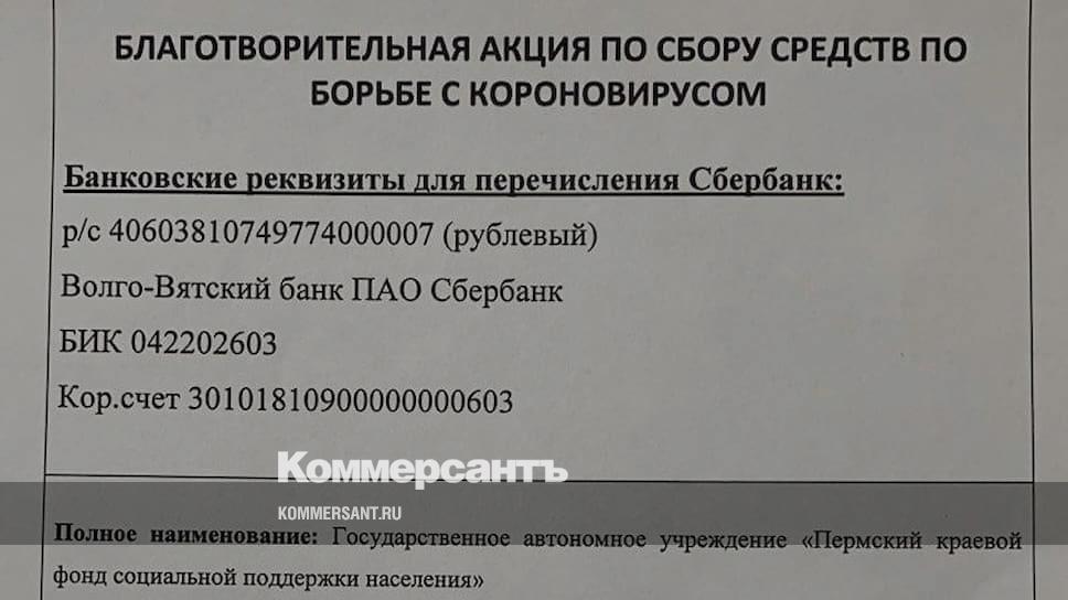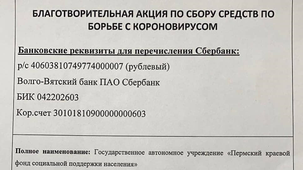 Пермский краевой фонд социальной поддержки населения начал благотворительную акцию по сбору средств на борьбу с коронавирусом. Пожертвования можно перечислить на счет Волго-Вятского банка ПАО «Сбербанк».