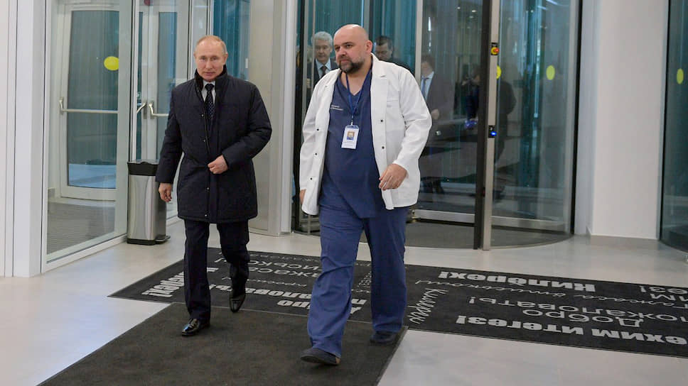 Президент России Владимир Путин (слева) и главврач больницы в Коммунарке Денис Проценко
