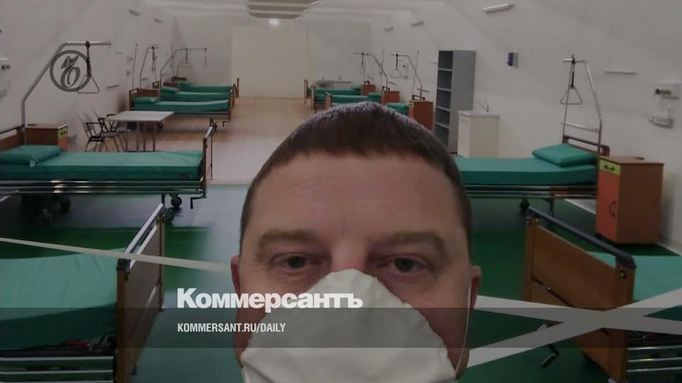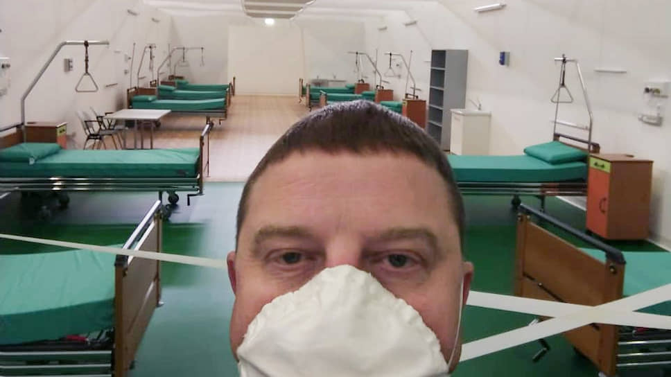 За спиной Александра Семенова госпиталь для тяжелобольных с коронавирусом в здании «Бергамо-ЭКСПО»