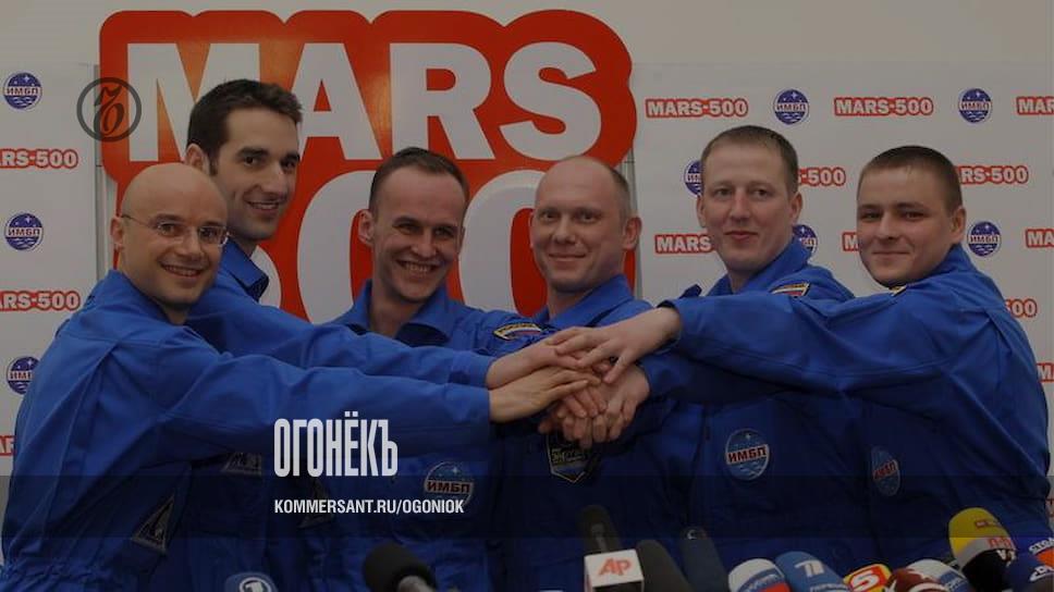 Участники эксперимента по изоляции на 105 суток с командиром экипажа космонавтом Сергеем Рязанским (на фото — третий слева). Команда имитировала полет на Марс