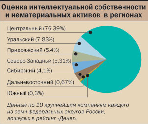 Отсутствие развитой законодательной основы бизнеса, связанного с интеллектуальной собственностью, в частности оценочного, является серьезным "рифом" для него. Например, профессия оценщика интеллектуальной собственности и нематериальных активов развивается действительно не столь бурно, как родственные ей оценочные профессии — оценщики бизнеса, движимого и недвижимого имущества. Так, у 100 крупнейших оценочных компаний России (по рейтингу журнала "Деньги" за 2002 год) на оценку нематериальных активов и интеллектуальной собственности пришлось менее 2% выручки (см. график).