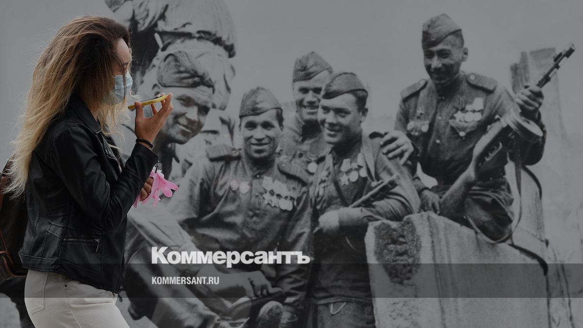 12 мая. Москва. Девушка в медицинской маске идет мимо плаката ко Дню Победы в первый день введения обязательного ношения масок и перчаток в общественных местах