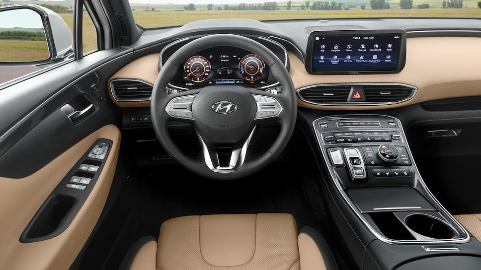 Также у машины переработан интерьер. Santa Fe получил новую мультимедийную систему с 10,25-дюймовым дисплеем, 12,3-дюймовую цифровую панель приборов и кнопочное управление коробкой передач.