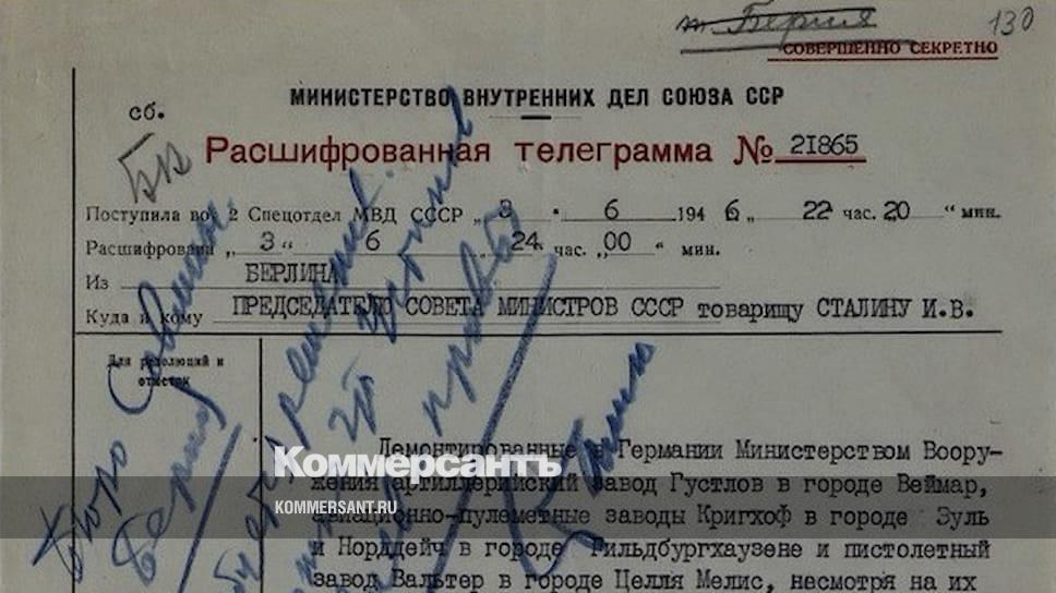 Демонтированные в Германии Министерством Вооружения артиллерийский завод Густлов в городе Веймар, авиационно-пулеметные заводы Кригхоф в городе Зуль и Норддейч в городе Гильдбургхаузен и пистолетный завод в городе Целля Мелис (правильно — Целла-Мелис.— «История»), несмотря на их большую значимость для промышленности вооружения переданы другим Министерствам и ими уже вывозятся. Артиллерийский завод Густлов изготовлял пушки для танков «Пантера» и «Тигр», с составными стволами и имел современную отработанную технологию. Пулеметный завод Норддейч изготовлял образцы пушки с электроспусками, электроперезарядкой и электро-синхронизаторами. Пистолетный завод Вальтер изготовлял лучшие немецкие пистолеты и имел хорошо отработанную технологию. С передачей этих заводов другим Министерствам мы лишаемся возможности перенять технический опыт по пистолетам — возможность быстро поставить их производство в СССР.