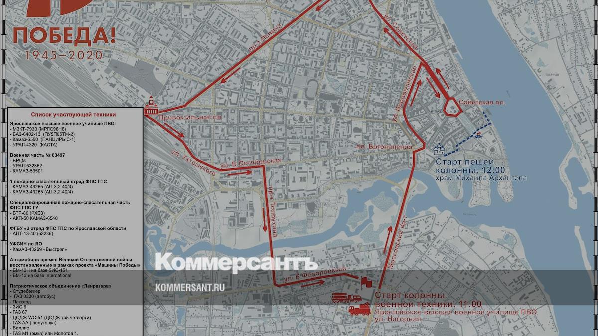 Движение военной техники начнется в 11:00 с Нагорной улицы. Колонна пройдет по Московскому проспекту до площади Богоявления. После этого сделает круг по Советской площади и направится на Советскую улицу через вокзальную площадь. Также маршрут частично пройдет по улице Большой Октябрьской и проспекту Толбухина. По улице Большой Федоровской колонна вернется на место дислокации.