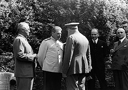 | Дядюшка Джо прекрасно знал, что преимущества личного общения с лидерами "большой тройки" (на фото) намного превосходят неудобства, создаваемые большой охраной (снизу) |