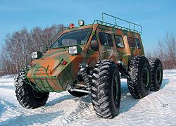 Еще один тип снеговездеходов, вышеупомянутые Argo, представляют собой трех-четырехостное "корыто" с приводом на все мосты, которое научено не только ползать по грязи, передвигаться по снегу, но и плавать. Этакий мини-БТР. Эксклюзивный производитель Argo на сегодняшний день — канадская фирма Ontario Drive & Gear Ltd. Несмотря на довольно ощутимую стоимость ($10-16 тыс. в зависимости от модели), недостатка в аргонавтах не наблюдается. "Арго" берут охотники, рыболовы-любители и просто любители прокатиться по бездорожью. Однако, чтобы ползти по снегу, недостаточно шести или восьми колес, пусть даже приводных. Проблема решается просто: на колеса натягивается гусеница, выполненная из морозостойкого полимера, и — в путь по сугробам и полыньям. При движении по снегу траки (стоимость этой дополнительной опции $2 тыс.) оставляют лишь двух-трехсантиметровую колею. Правда, по отзывам архангельских геологов, закупивших перед прошлогодним сезоном экземпляр этой чудо-техники, ходовая полетела через три с половиной месяца интенсивной эксплуатации. Argo все-таки скорее прогулочная, а не рабочая машинка.