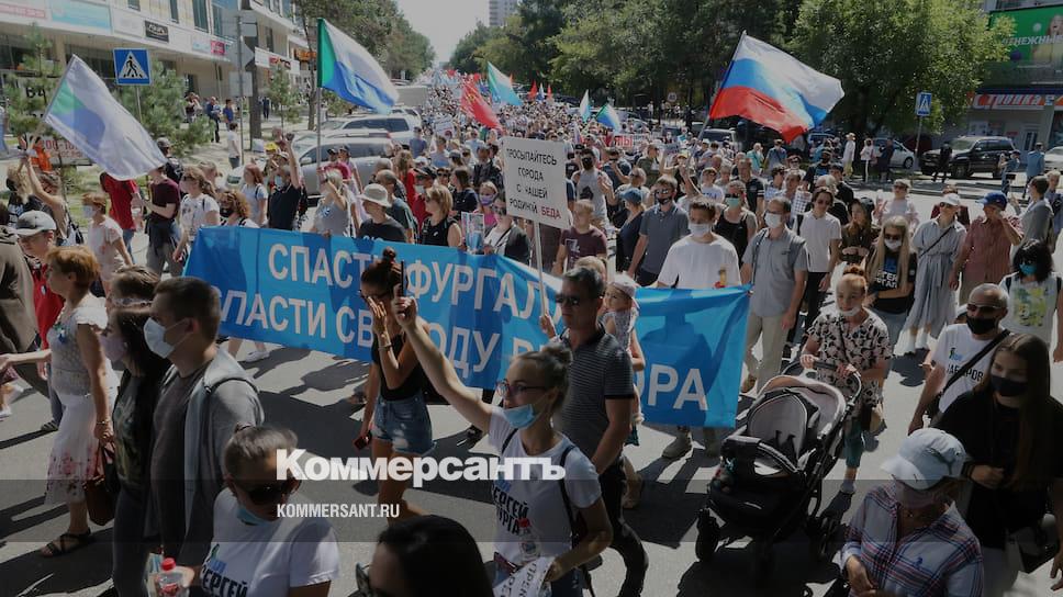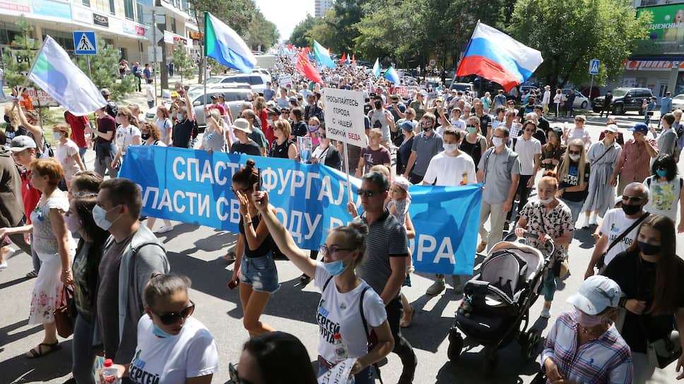 В Хабаровске прошли очередной митинг и шествие в поддержку арестованного по обвинению в организации заказных убийств экс-губернатора Сергея Фургала. Власти и протестующие традиционно разошлись в оценках: мэрия бывшей столицы Дальневосточного федерального округа (ДВФО) насчитала 1,5 тыс. участников, а участники отметили, что их колонна растянулась по улицам на несколько километров. Митинги против ареста и отставки господина Фургала сопровождаются все более разнообразными политическими лозунгами и длятся уже 43 дня. Сегодня граждане в седьмой раз заполнили центральную площадь и улицы Хабаровска.