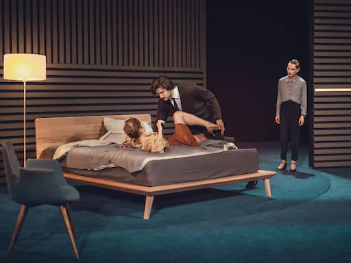 Декорации Зиновия Марголина выше всяких похвал: ребристые стены дома Араминты (богатой вдовы, вокруг которой закручивается интрига), убранного в скандинавском стиле, из десятого ряда партера нет-нет да и напомнят экранную рябь или видеоарт. То есть театр учитывает, что мы возвращаемся из онлайна в офлайн, и, чтобы сгладить резкость перехода, живая сцена слегка симулирует экран. А потом вдруг две стены начинают вращаться на поворотном круге. Так кабинет, в котором романтичная Араминта (Виктория Исакова) экзаменует своего нового секретаря Доранта (у Федора Левина отличный дебют), превращается в мини-спортзал, где ее маменька, госпожа Аргант (Вера Алентова), упражняется на беговой дорожке. Действие в спектакле Писарева происходит сегодня, сейчас, и зритель даже почти не смеется, когда мадам отгоняет Доранта, прошипев: «Дистанция» (мало кто может проделать это с той же комичной небрежностью, как Алентова). А потом прерывает разговор заливистым смехом: вмонтированный в тренажер экран привлекательнее, чем реальная беседа с занудным юношей, который отказывается уговорить ее дочь выйти за богатого соседа.