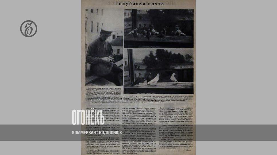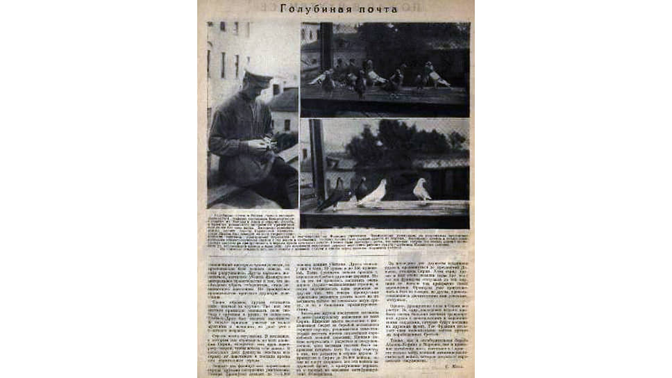 «Голубиная почта России возрождается. Недавно состоялись Всесоюзные состязания из Москвы в Клин и обратно. Голубь в качестве посыльного за границей применялся еще сотни лет тому назад,— писал "Огонек".— Интересно вспомнить эпизод времен борьбы Парижской Коммуны, когда Париж был осажден со всех сторон соединенными войсками французской буржуазии и наступавших на Францию пруссаков. Французские коммунары на коллоидных пластинках помещали микроскопические снимки с тех депеш и сообщений, которые нужно было распространить из Парижа. Маленькая пленка в четыре квадратных сантиметра прикреплялась к перьям крыла почтового голубя. Пленка была настолько легка, что почтовые голуби без особых усилий проносили до восемнадцати пленок в один рейс. Так оказывали содействие первому восстанию рабочих голуби — любимцы парижских гаменов».