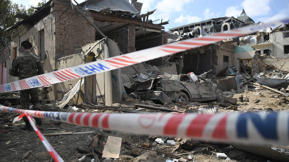 Серьезно пострадали и соседние дома — у многоэтажек практически снесен верхний этаж, два небольших здания недалеко от эпицентра разрушены полностью — в одном из них каким-то чудом остался стоять шкаф с домашними закрутками. Стекла же выбиты практически во всем квартале — даже на соседних улицах оконные рамы как будто вдавлены внутрь. Район, куда упала ракета, жилой, из стратегических объектов поблизости разве что железнодорожный вокзал. Аэропорт, где, по данным Еревана, базируются турецкие F-16 и по которому армянские силы целились ранее,— в семи километрах.