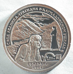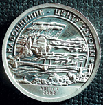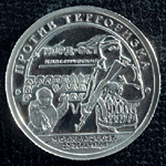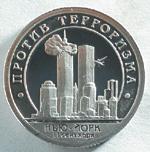 Идущая по периметру сверху от изображения надпись лаконично поясняет смысл выпуска: "Против терроризма". Внизу в две строки — место и дата трагического события: "Нью-Йорк, 11 сентября". На реверсе другого выпуска того же года изображена подлодка "Курс", поднимаемая специальной баржей. В верхней части монеты по окружности надпись, поясняющая изображение: