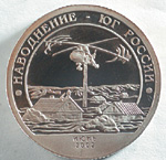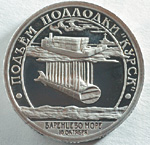 "Подъем подлодки 'Курск'". В нижней части монеты в две строки: "Баренцево море, 10 октября".