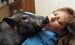 Как друг и член семьи мини-пиг вполне выдерживает конкуренцию с собаками и кошками. Свинки не пахнут, их приятно гладить, и они очень отзывчивы на ласку. Пиги провожают и встречают любимых хозяев, виляя хвостиком, и могут жить в собачьем домике. Каждый их хрюк наполнен смыслом, а голосовые возможности гораздо богаче собачьих. Иные мини-пигщики уверяют, что их питомцы отчетливо произносят слова "мама", "не буду" и "дай".