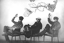 Армейские политорганы всячески поощряли антифашистскую шутку. В военных мемуарах часто повторяется такой рассказ о солдатской смекалке. Красноармейцы на передовой устанавливали чучело Гитлера — чтобы оно было видно неприятелю. Поскольку немцы не хотели стрелять в своего фюрера, им приходилось совершать вылазки с целью чучело убрать. Однако советские солдаты были начеку, поэтому посланный фашистский отряд погибал, а чучело оставалось на прежнем месте. Даже в брежневской "Малой земле" есть история про то, как в день рождения Гитлера, 20 апреля, была вывешена карикатура на него, которую немцы никак не могли снять. Тут возникает вопрос — почему им, в свою очередь, не пришло в голову выставить карикатуру на Ленина, родившегося 22 апреля.