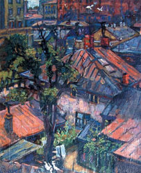 Евгения Окса открыла лет десять назад галерея "Ковчег" в своем проекте "Незабытые имена". Ровесник революции, он начал учится в Петрограде — у Александра Яковлева, Владимира Шухаева, Михаила Добужинского. Потом, уже в Москве 1920-х, попал под влияние французской живописи — Андре Дерена, Мориса Вламинка, Пабло Пикассо. К тридцати годам, когда художнику полагается вырабатывать свой стиль и начинать зарабатывать деньги, советская страна потребовала от него творчества в стиле социалистического реализма. Не то чтобы Окс наотрез отказывался писать "Девушек метро у камнедробилки" (он даже поставил такую картину в свой личный план), но что у него могло получиться, если рабочая тетрадь художника изобиловала заметками типа "Три милиционера на лошадях. Сделать в коричневом с золотистым светом на первом коне. Свет: у второго милиционера кончик носа, губы, подбородок, сильная тень от козырька". Евгения Окса интересовали игра света и цвета, ритмика форм. Вот и пришлось "для денег" работать техническим графиком в издательствах, а "для себя" — писать московские дворики и переулки. На выставке представлены работы в основном из собрания семьи художника.