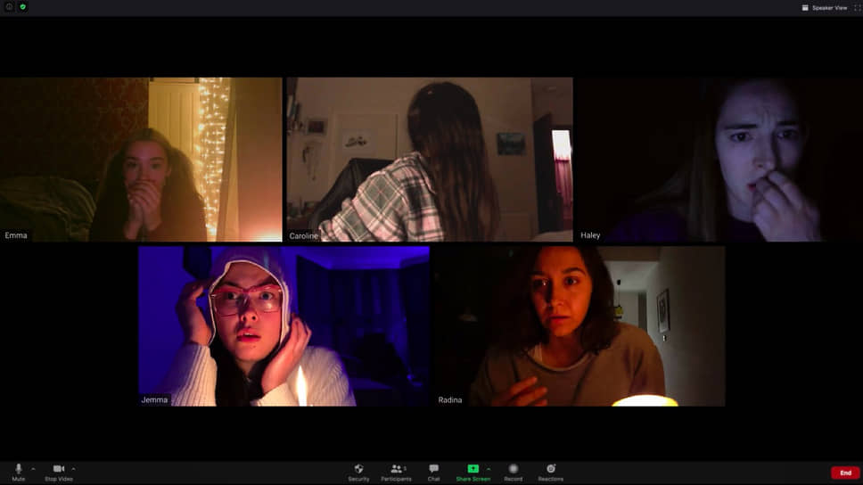 Короче говоря, пять девиц и один бородатый толстяк решили созвать Zoom-конференцию с дамой-медиумом, чтобы пообщаться с неким духом. О смелых экспериментаторах сказать по большому счету нечего. У Джеммы, например, желтые ногти и китайские бабушка с дедушкой. У Радины — прыщи, кудряшки и кашель. У Кэролайн — «милый и похотливый», что звучит вопиюще неполиткорректно, папа. Впрочем, папа разок мелькнет на мониторе Кэролайн и куда-то запропастится. Надо надеяться, что дух покарал его первым за милую похотливость. У Тедди — дом с бассейном и веселая бабенка под боком. Медиум Сейлан напоминает утомленную Веранду Брахмапутру из «Колбасного оккультизма», предсказывавшую герою будущее по собранию русских народных пословиц и поговорок.