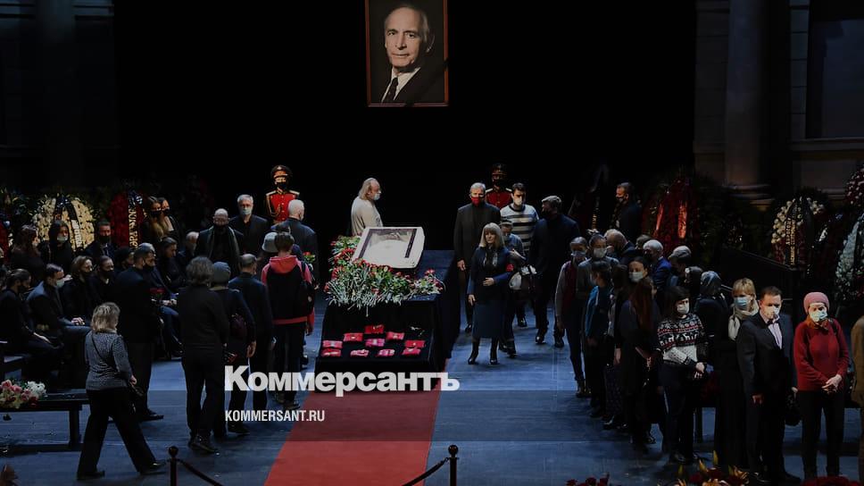 Пришедшие проститься проходили через главный вход и поднимались на сцену. В центре стоял закрытый гроб, перед ним — государственные награды. Слева и справа были расположены места для родных и близких артиста, сообщает корреспондент “Ъ”.