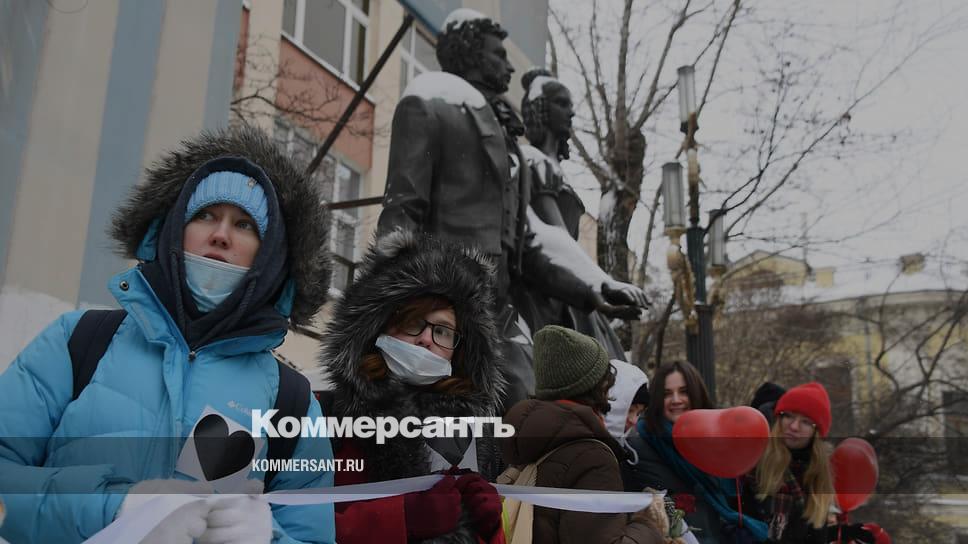 Аналогичная акция прошла в Санкт-Петербурге. Участницы выстроились в цепь на Воскресенской набережной у памятника жертвам политических репрессий. Как сообщает корреспондент “Ъ” с места событий, в акции участвовали несколько десятков человек — преимущественно девушки.