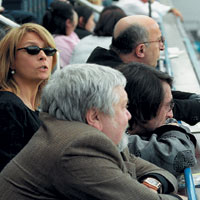 | | ФОТО: ВАЛЕРИЙ ЛЕВИТИН | | Стадион Chelsea, команда Chelsea играет с Everton. Слева направо: композитор Энри Лолашвили, альтист Юрий Башмет и кинорежиссер Сергей Соловьев следят за воротами Chelsea, а главный редактор русского Vogue Алена Долецкая — за воротами Everton |