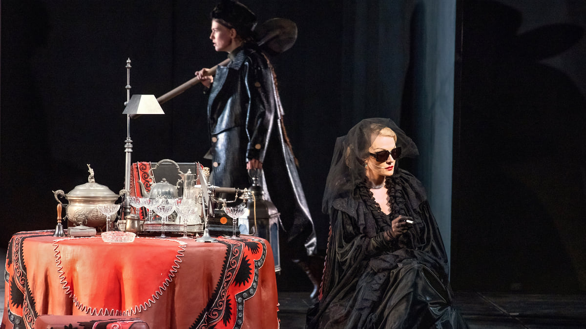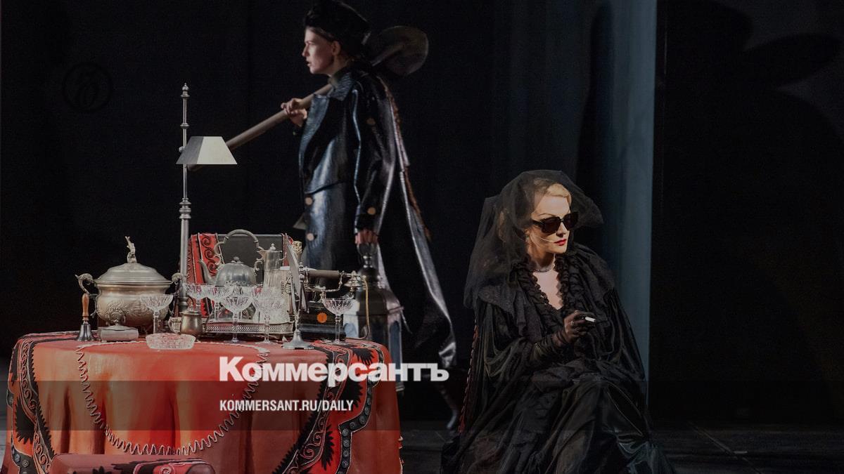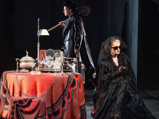 Художник Сергей Февралев построил на сцене МХТ интерьер кинопавильона, красные драпировки превращают его в подобие дома звезды (дом для нее — съемочная площадка, другого не надо), а все остальное преображается согласно ее замыслам. Иначе не объяснить, почему, например, шины авто, на котором разъезжает молодой сценарист-неудачник Миша Мышкин (Павел Табаков), лопаются именно у ворот ее виллы. Миша и рад бы выбраться из паутины — дива не особо скрывает, куда девались ее предыдущие любовники (само собой, закопаны в саду), зато ясно формулирует запрос: кто-то должен доработать сценарий, с которым она вернется в кино. Сей многотомный труд вывозят на тележке.