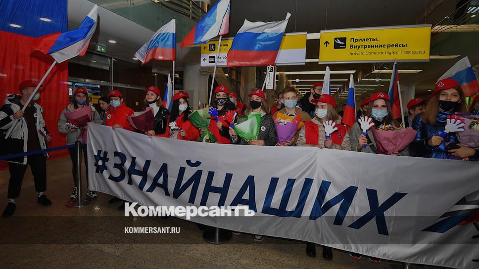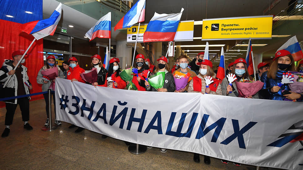 После прохождения паспортного контроля спортсмены вышли к болельщикам, которые встречали их, исполняя гимн России.