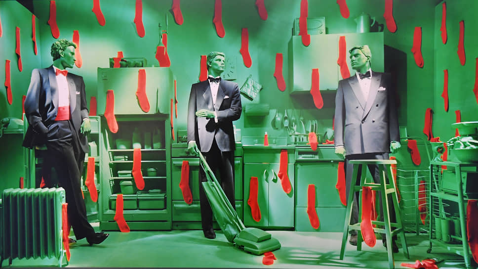 Самые яркие фотографии этой выставки тут же, с вернисажа, разлетелись по соцсетям, падким до всего забавного и необычного. Первым делом, понятно, кошки: стая животных ядовито-зеленого цвета атаковала обшарпанное жилище пожилой пары, будто выкрашенное вместе с одеждой героев снимка серой краской. Он сидит за столом, она открыла холодильник, а кошки в ожидании еды вьются по всей комнате, в виде скульптур они есть и перед фотографией, в самой экспозиции. Подобный сюр и с другими снимками: по столам ресторана скачут рыжие лисы; в пустом, карамельных цветов, интерьере хозяйничают черные белки; синюю детскую комнату с двумя подростками наводнили золотые рыбки. Да, изображения странные, хотя сейчас, когда существует столько цифровых редакторов и приложений, способных воплотить самый невероятный сюжет, чем-то таким трудно удивить. Но и на этом фоне большеформатные фотографии Сэнди Скогланд озадачивают сюжетами, особенно если учесть время их создания: «Радиоактивные кошки» появились в 1980 году, другие снимки — годом позже. Художница сама создавала декорации, приглашала статистов либо населяла комнаты манекенами и собственноручно изготовленными животными, чтобы все это снять на пленочный фотоаппарат и в итоге вызвать у зрителя замешательство, сомнение в достоверности фотографии как таковой.