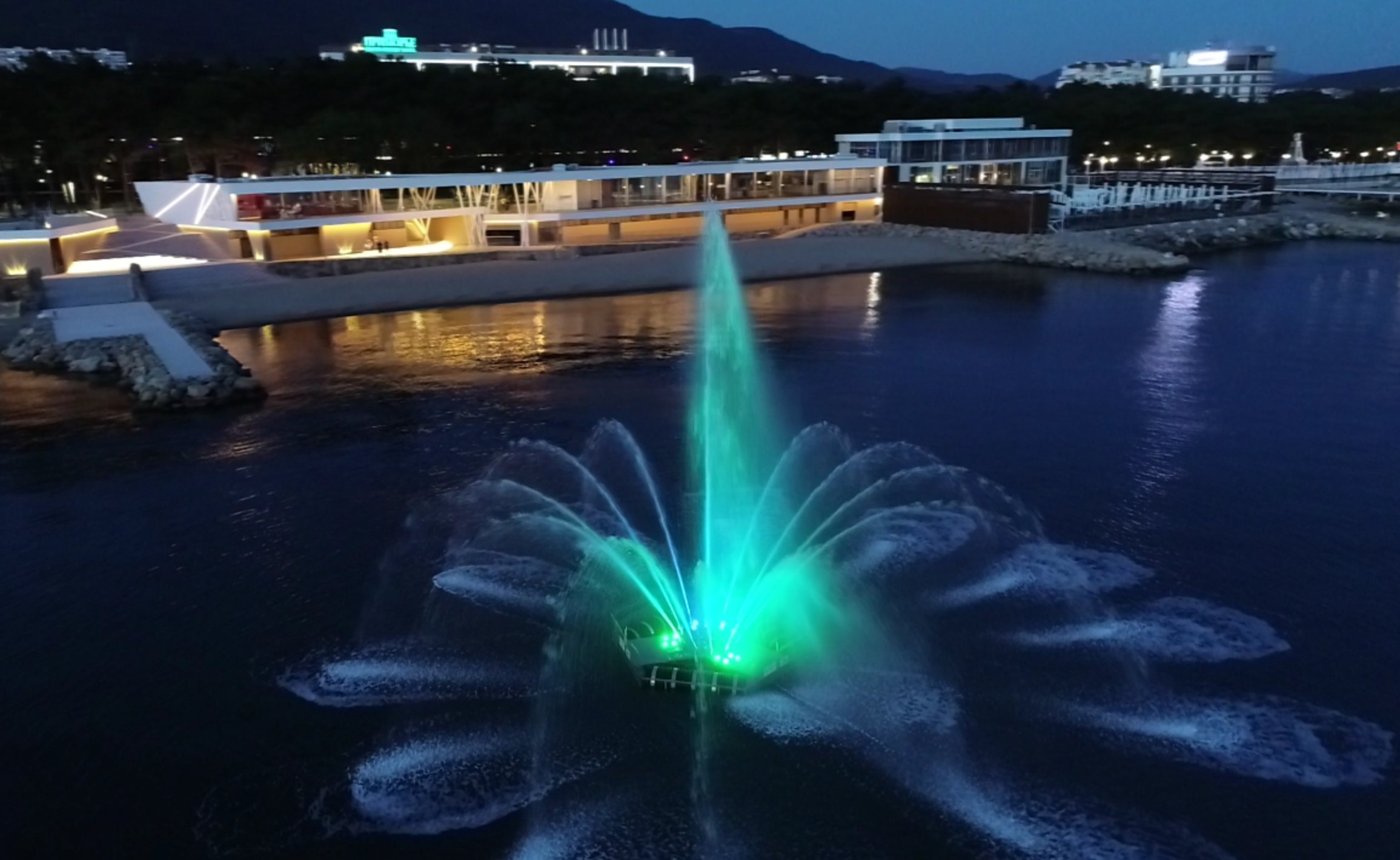 Плавающий светомузыкальный фонтан запустили в Геленджике в июне 2020 года. Фонтан расположен в 50 м от береговой линии. Как отмечали в курортном комплексе «Приморье Grant Resort», понтонная конструкция должна была защитить фонтан от удара волн. Систему удерживают три якоря, установленные на глубине 3,5 метра. Стоимость морского фонтана, оснащенного системой динамического светомузыкального представления, не называлась.