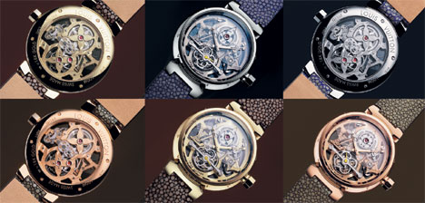 Материал для ремешка — galuchat 10 цветов, крокодиловая кожа 20 цветов или телячья кожа 5 оттенков. На браслете Tambour Monogram Tourbillon выпускаться не будут ("с браслетом они уж больно тяжелые", жалуются испытатели), равно как не будут выпускаться и в меньшем размере.