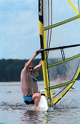 Между тем поклонники виндсерфинга в первую очередь зависят именно от погоды. В этом мы убедились в первый же день знакомства с этим видом отдыха. Отправившись на один из подмосковных водоемов, мы рассчитывали взять у знающих людей первый урок мастерства и предполагали тут же выйти под парусом в открытое водное пространство. Каково же было наше разочарование, когда на месте нам объяснили, что "покататься вряд ли удастся": нет ветра. Пришлось ограничиться купанием, скромной порцией ультрафиолета и вернуться домой.