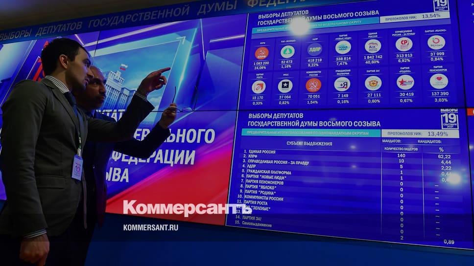В течение трех дней — с 17 по 19 сентября — в России прошли выборы в Госдуму VIII созыва, в девяти регионах выбирали губернаторов, в 39 — депутатов заксобраний, в 11 административных центрах — местные парламенты. По результатам обработки 98% протоколов, в Госдуму проходят пять партий: «Единая Россия» (49,79%), КПРФ (19,04%), ЛДПР (7,48%), «Справедливая Россия — За правду» (7,41%) и «Новые люди» (5,36%). Как подводили итоги выборов — в онлайн-трансляции “Ъ”.