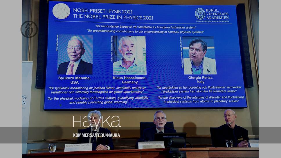 Шведская королевская академия наук объявила имена лауреатов Нобелевской премии по физике в 2021 году. Половину суммы 10 млн шведских крон (около $1,14 млн) разделят между собой Сюкуро Манабэ из США и Клаус Хассельман из Германии. Они получат награду «за физическое моделирование климата Земли, количественную оценку его изменчивости и надежное прогнозирование глобального потепления». Вторая половина суммы присуждена Джорджо Паризи из Италии «за открытие взаимодействия беспорядка и флуктуаций в физических системах от атомных до планетарных масштабов».