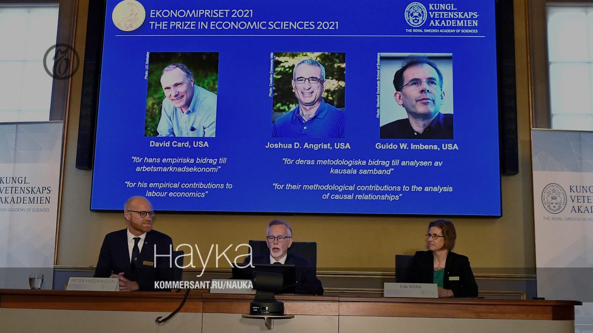 Обладателями премии Банка Швеции по экономике имени Альфреда Нобеля стали американские экономисты Дейвид Кард, Джошуа Ангрист и Гвидо Имбенс. Дейвид Кард (половина премии) получил награду «за эмпирический вклад в экономику труда», а Джошуа Ангрист и Гвидо Имбенс (по четверти премии) — «за методологический вклад в развитие и анализ причинно-следственных связей».