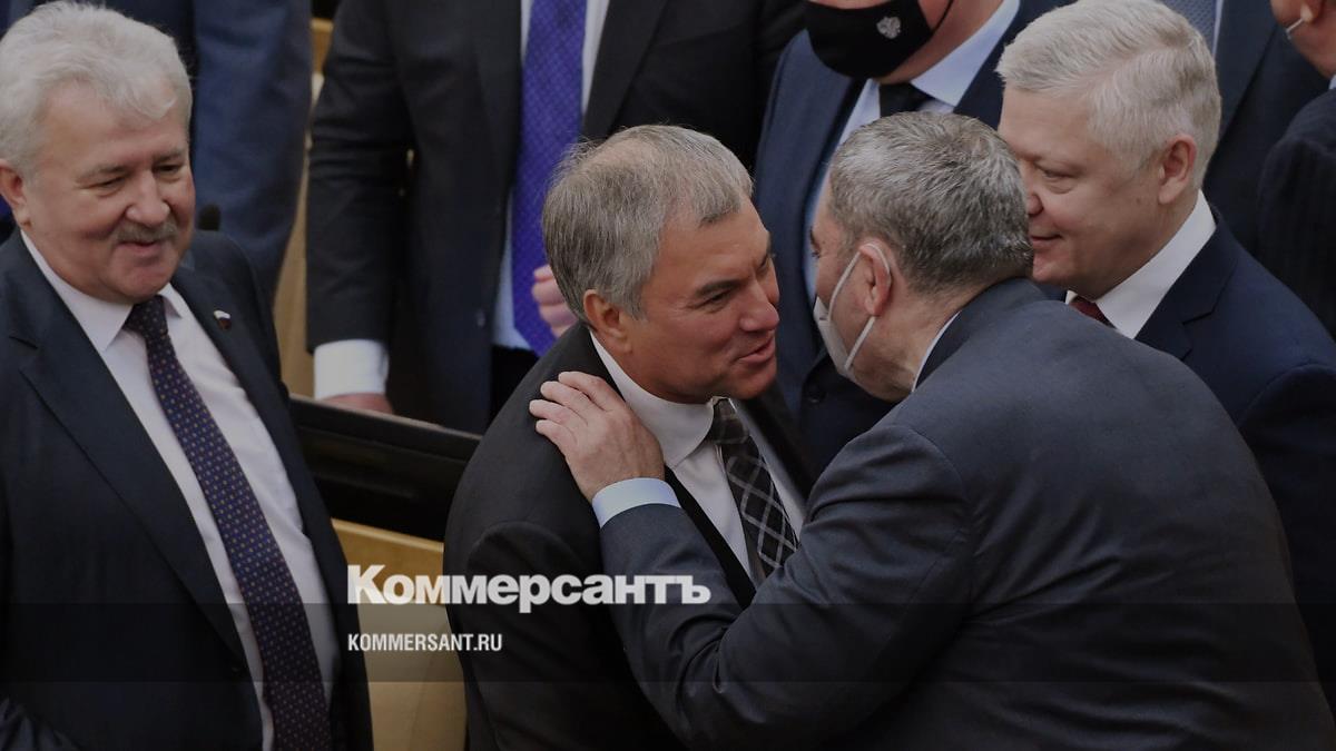 Слева направо: депутат Евгений Москвичев, председатель Госдумы Вячеслав Володин, депутаты Леонид Симановский и Василий Пискарев перед началом заседания