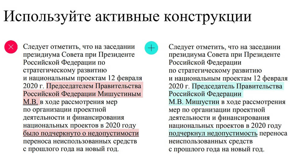 - использовать активные конструкции,