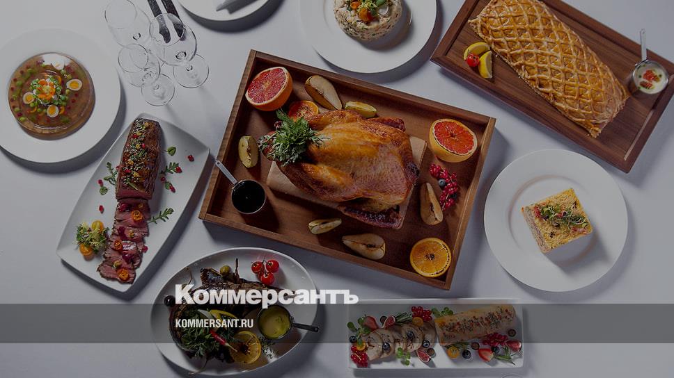 Меню очень обширное. Разнообразить стол предлагается, например, кулебякой из трех видов рыбы (по рецепту 1905 года), праздничным английским блюдом — говядиной «Веллингтон» с грибным дюкселем и соусом из красного вина с трюфелем, пельменями «Шаляпин» с начинкой из оленины и жареного лука, ростбифом a la russe с каперсами, соусом из тунца, редисом, шпротами и перепелиным яйцом.