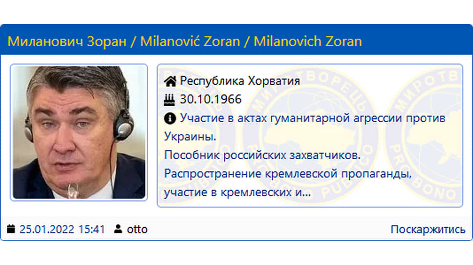 На сайте отмечается, что господин Миланович занимался распространением «кремлевской пропаганды», участвовал «в кремлевских информационных спецоперациях», «в актах гуманитарной агрессии против Украины», а также «поддерживал и оправдывал российскую агрессию против Украины».