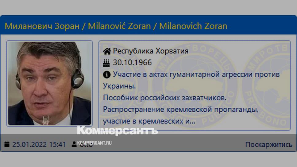 Президент Хорватии Зоран Миланович включен в базу украинского ресурса «Миротворец». Глава государства попал в этот список как «антиукраинский пропагандист» и «пособник российских захватчиков».