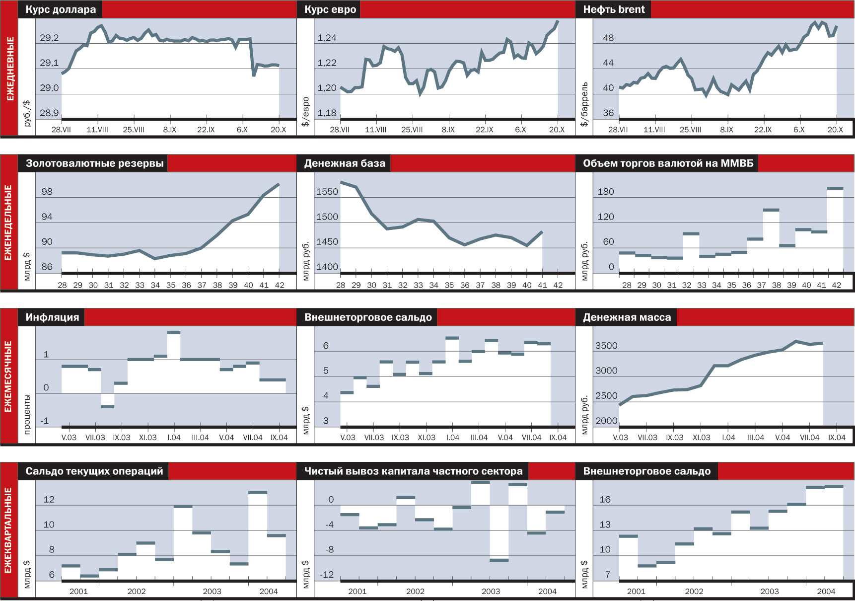На фондовых рынках США дела обстоят так же плохо. Индексы идут в направлении, противоположном цене нефти. Индекс Dow Jones находится ниже отметки 9900 пунктов, а индекс S & P 500 с трудом удерживается выше 1100 пунктов. Еще хуже обстоят дела с американской валютой. Курс доллара относительно евро на прошлой неделе упал ниже $1,26 за евро, что является минимальным за последние восемь месяцев значением. Как ни странно, некоторые чиновники в США в этом ничего удивительного не увидели. Например, глава отделения ФРС в Далласе Роберт Мактир заявил, что в долгосрочной перспективе у доллара один путь — вниз. Официальную точку зрения в середине прошлой недели озвучил секретарь казначейства США Джон Сноу, который еще раз повторил тезис о поддержке политики сильного доллара. Правда, скептики говорят о том, что чиновник пробудет на своем посту только до выборов. Так что настрой трейдеров, готовящихся повторить ралли евро конца прошлого года, вполне оправдан.
