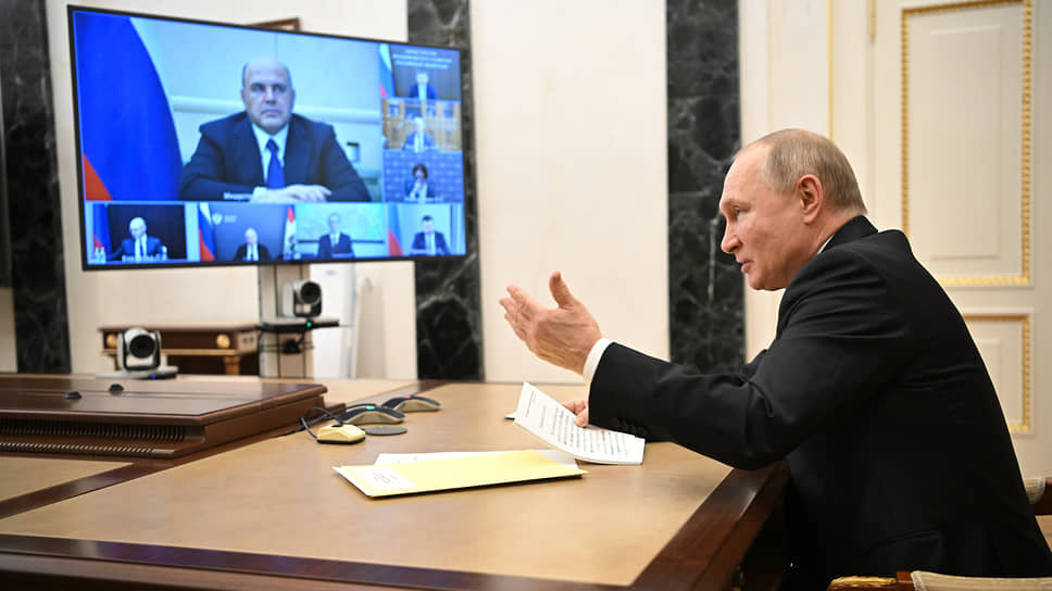 Премьер-министр России Михаил Мишустин (на экране) и президент Владимир Путин
