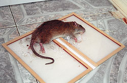 Часа в 4 утра из кухни раздались хлопки — как будто кто-то шлепал книжкой по кафельному полу. Я кинулся на звук — в ловушку попалась крыса длиной в пару пачек сигарет. Увидев меня, она попыталась оторваться, но прилипла совсем уже безнадежно, все телом. Судя по размеру, крысак был не наш, из бани, а какой-то залетный и, похоже, именно он был автором погрома, учиненного в кладовке. Наглая тварь вдруг начала верещать на весь дом, и ее мучения пришлось прекратить палкой.