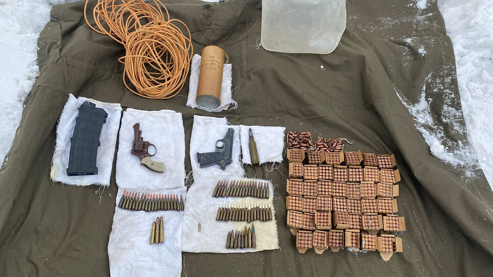 В результате проверки данных правоохранители обнаружили схрон с арсеналом — пистолет системы «Вальтер», револьвер, магазин к охотничьему ружью, детонирующий шнур ДШВ длиной 25 м, имитационный патрон ИПМ-100 и свыше 760 патронов различного калибра.