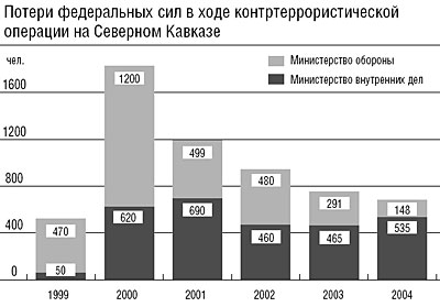 Министр обороны рассказал, что в результате целенаправленных действий по переводу армии на контрактную основу неуклонно с каждым годом сокращается число погибших в Чечне. Он привел оптимистичную статистику: в 2001 году в Чечне погибли 490 человек, в 2002-м — 480, в 2003-м — 290. За 10 месяцев 2003 года российская армия потеряла в Чечне всего 140 человек. Еще лет через десять войны в Чечне число погибших контрактников, наверное, и вовсе сократится до необходимого минимума.